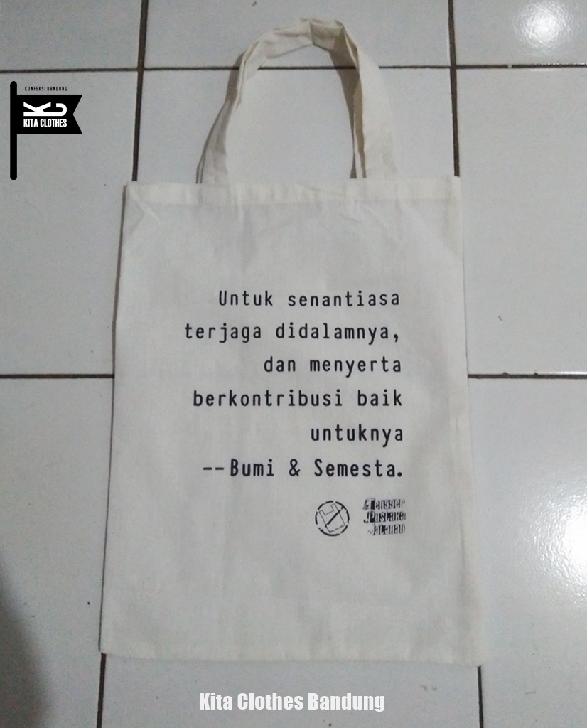 Ini adalah pesanan tote bag berbahan blacu dengan tulisan disablon. Pesanan dari komunitas Tengger Pustaka Jalanan. Terima kasih atas kepercayannya telah memesan kebutuhan produksi tote bag di Kita Clothes Bandung.